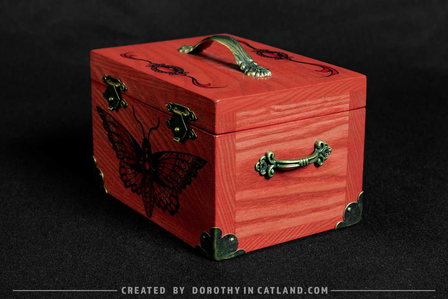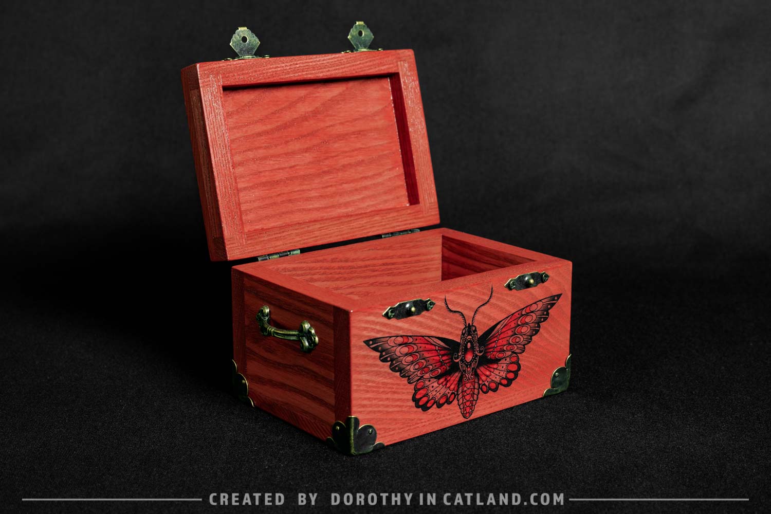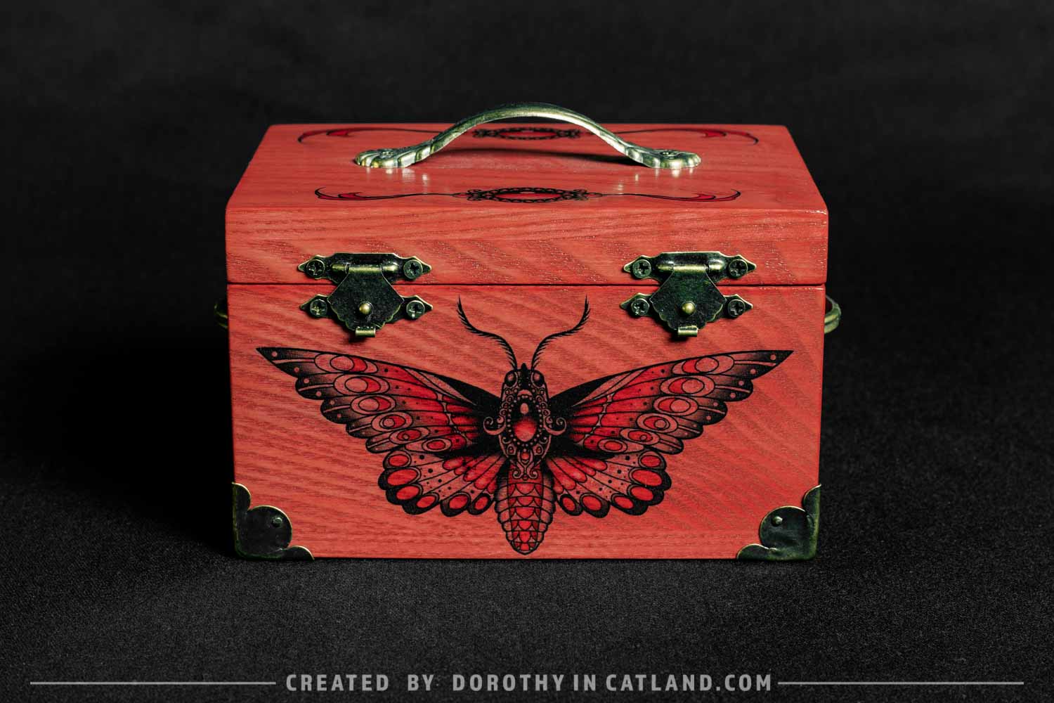 The wooden box is little and lovely. Both inner and outer side are pink (more precisely: light carmine pink color). Right in the front there is a beautiful moth originally conceived in a tattoo-styled design. Also, there is a pair of ornaments on the lid, well-fitting to the leitmotif. Decorative metal fittings in antique bronze colour are included to add some vintage charm.