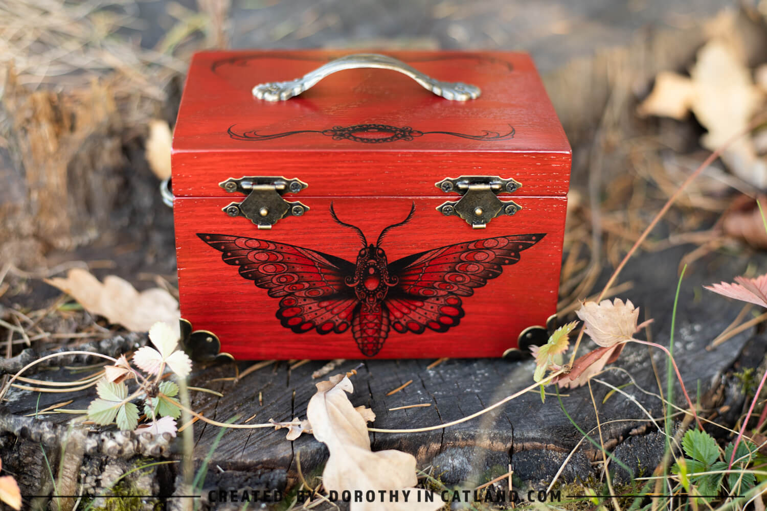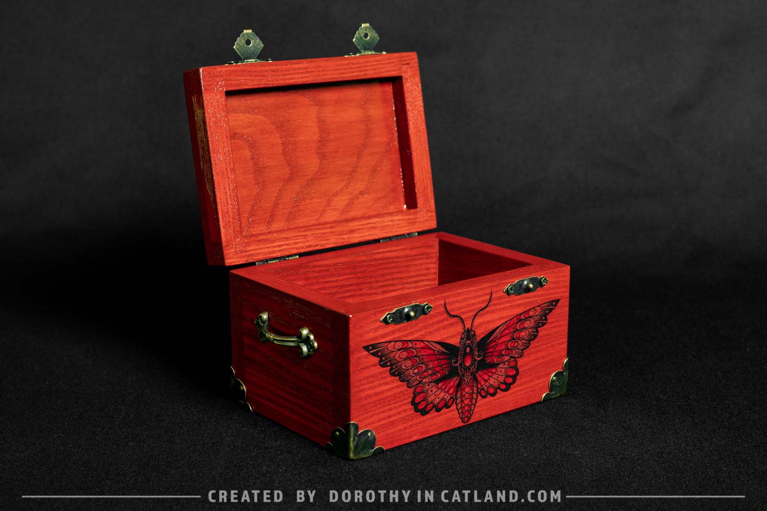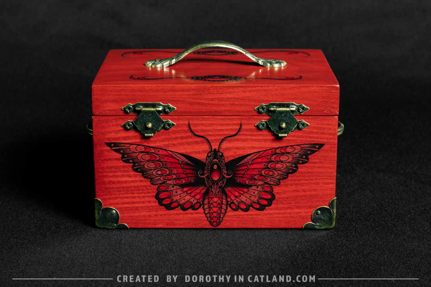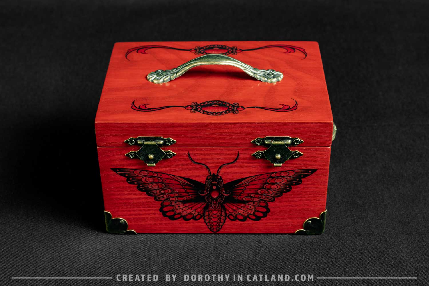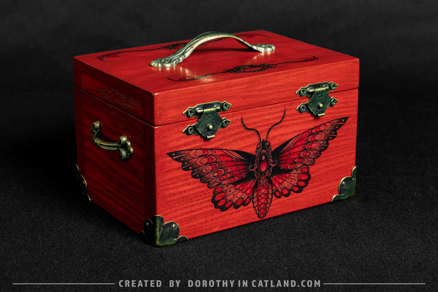 The wooden box is little and lovely. Both inner and outer side are intensely red (more precisely: rufous color). Right in the front there is a beautiful moth originally conceived in a tattoo-styled design. Also, there is a pair of ornaments on the lid, well-fitting to the leitmotif. Decorative metal fittings in antique bronze colour are included to add some vintage charm.