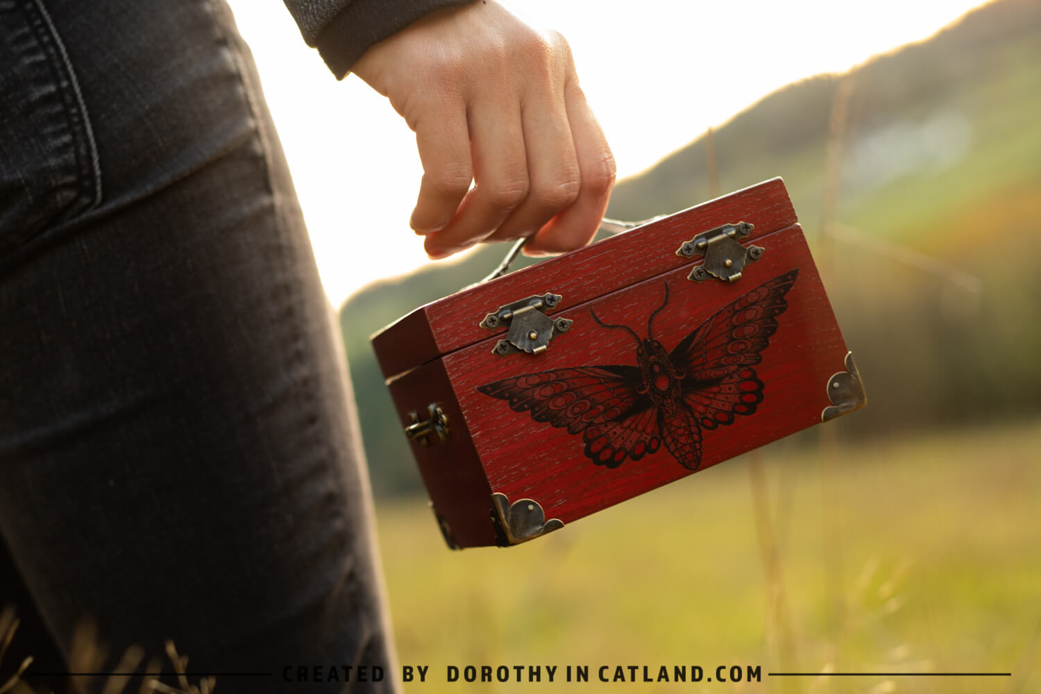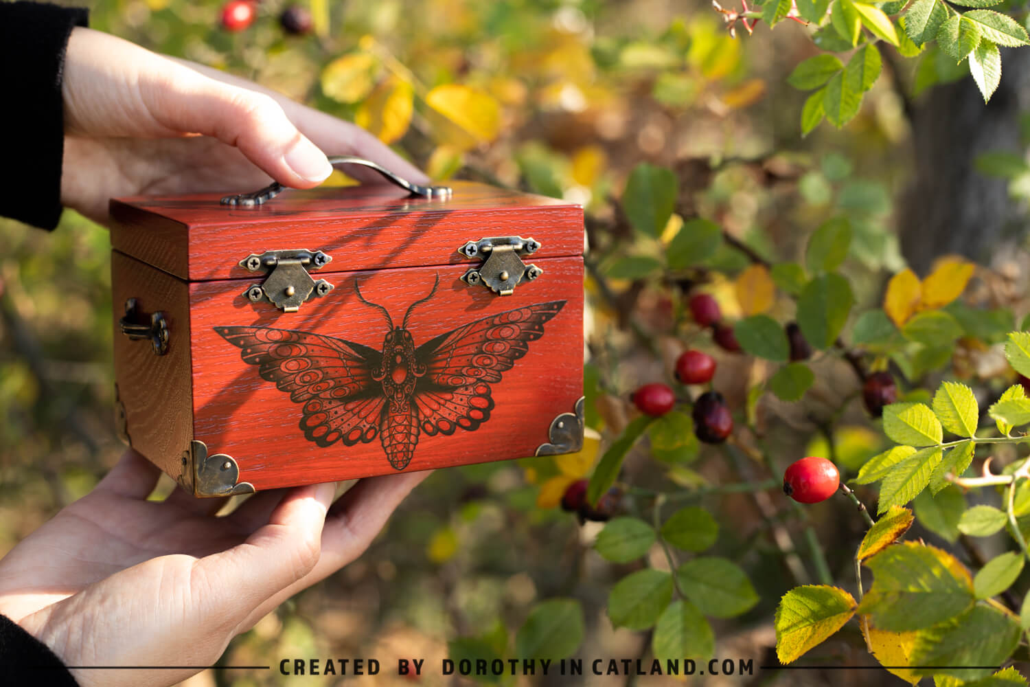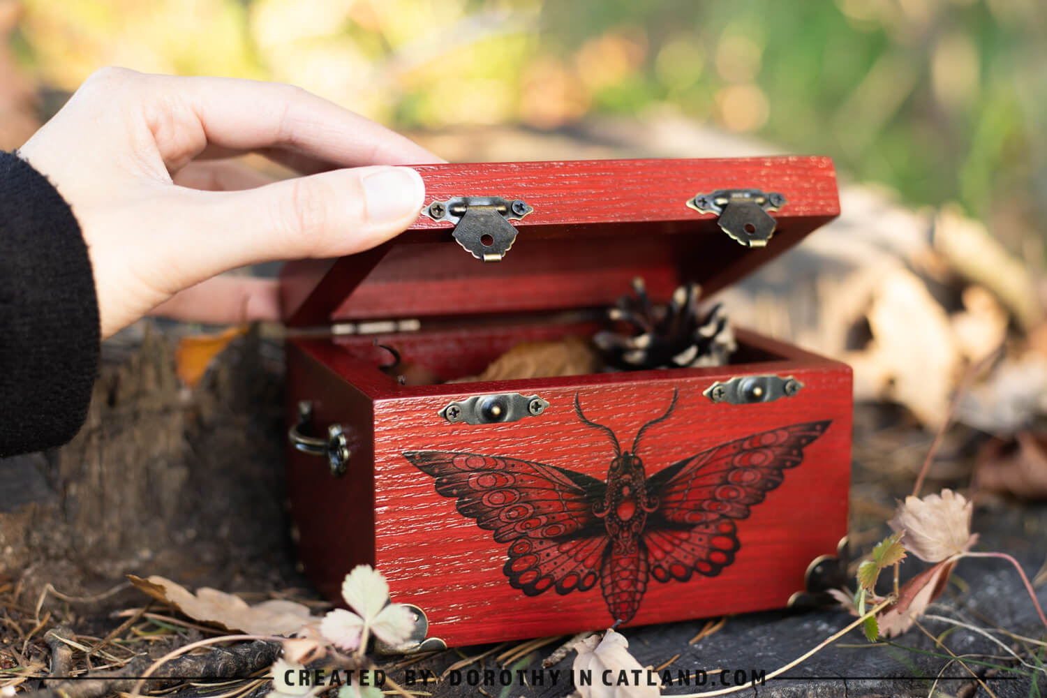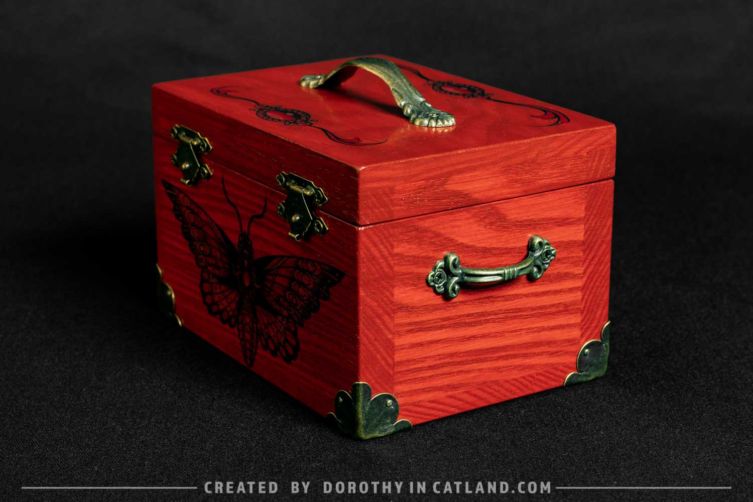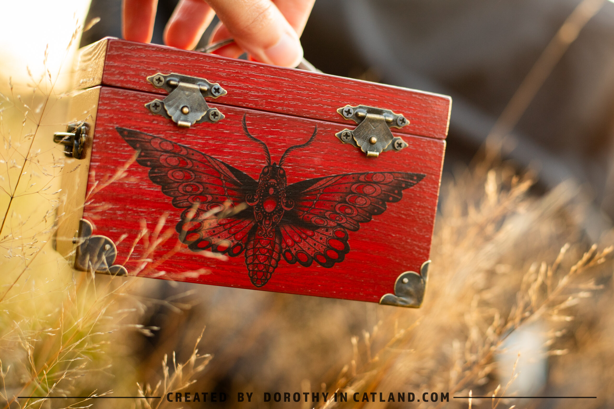 The wooden box is little and lovely. Both inner and outer side are intensely red (more precisely: rufous color). Right in the front there is a beautiful moth originally conceived in a tattoo-styled design. Also, there is a pair of ornaments on the lid, well-fitting to the leitmotif. Decorative metal fittings in antique bronze colour are included to add some vintage charm.