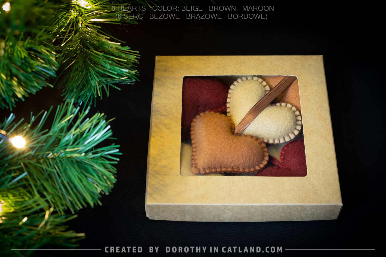 These hanging decorative ornaments are made from felt, filled with a soft polyester wadding, thoroughly and aesthetically sewn with a thick thread. Come with a ribbon. Each and every heart is almost identical both on left and right side. Once done, I pack them very carefully to stylish boxes and due to this the whole set looks just gorgeous.