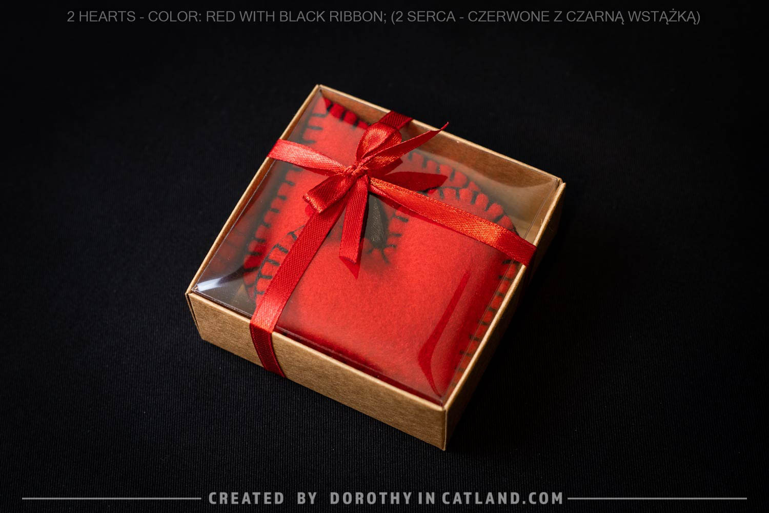 Red hearts – hanging ornaments with black ribbon are also available in a version with a brown ribbon with dots.