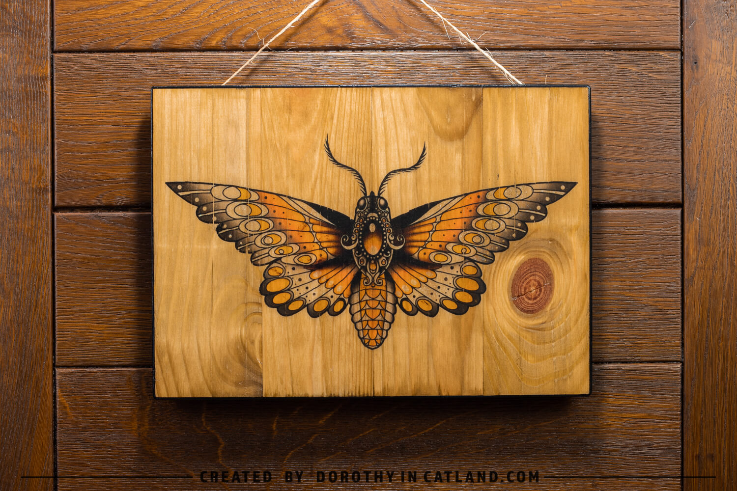 I painted this wall decor in light brown colour and by using the decoupage technique I applied on the wood a beautiful, big design of moth in yellow. The moth was designed by my brother Chris Rat Tattooer. In order to add to the drawing a bit of elegance and charm the edges were pained in black. The whole item was lacquered a few times.